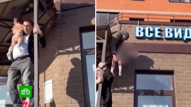На видео попали самые ответственные минуты операции по спасению ребенка в Люберцах. Прохожие, испробовав все, поняли, что только так: один сверху, второй снизу — можно безопасно спустить малыша с четырехметровой высоты. Ребенка на козырьке вовремя заметила жительница дома Валентина.