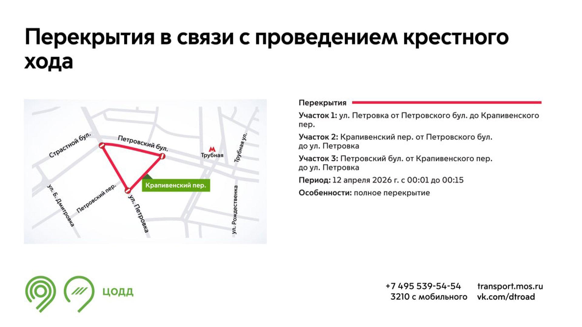 В ночь на 12 апреля в Москве перекроют ряд улиц. Ограничения связаны с проведением крестного хода и коснутся улицы Петровки, Крапивенского переулка и Петровского бульвара.