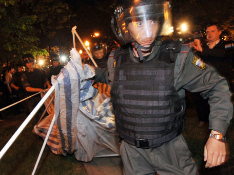 Полицейские задерживают оппозиционеров, которые пытаются разбить протестный лагерь в центре Москвы, на Арбате — у памятника Булату Окуджаве. Активистов усаживают в полицейские автозаки и везут в участки, передают очевидцы.