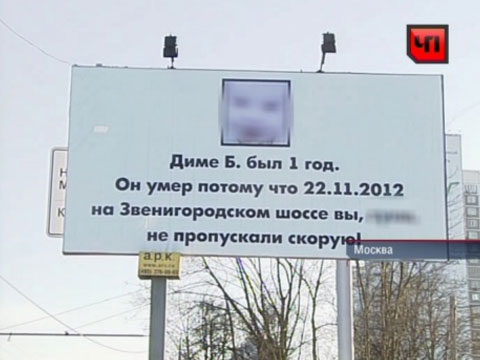 На билборде размещена фотография ребенка, и черными буквами на белом поле написано: «Диме Б. был 1 год. Он умер потому что 22.11.2012 на Звенигородском шоссе вы, с***, не пропускали скорую».