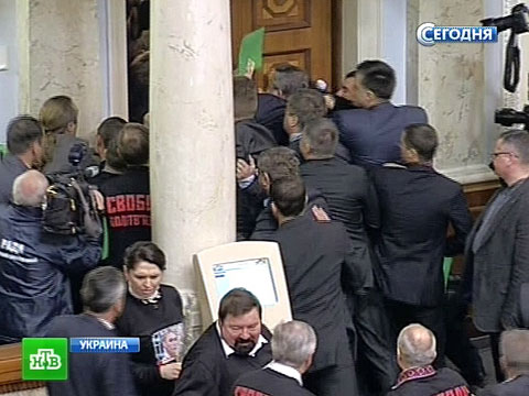 Новая Верховная рада начала работу со скандала. Депутаты устроили рукопашный бой, а активистки FEMEN в необычных нарядах попытались прорваться в здание парламента.