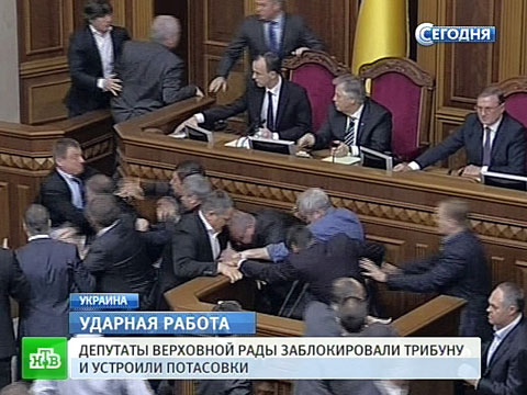 Парламент пока целиком во власти новой фракции националистов из партии «Свобода». Утреннее перемирие продлилось недолго. Оппозиция увидела, как члены «Партии регионов» голосуют за себя и за того парня, то есть чужими карточками. Взревев от возмущения, свободовцы бросились из своего угла к президиуму, им навстречу — регионалы. Через секунду вокруг трибуны уже шла самая жестокая парламентская драка за последние несколько лет.