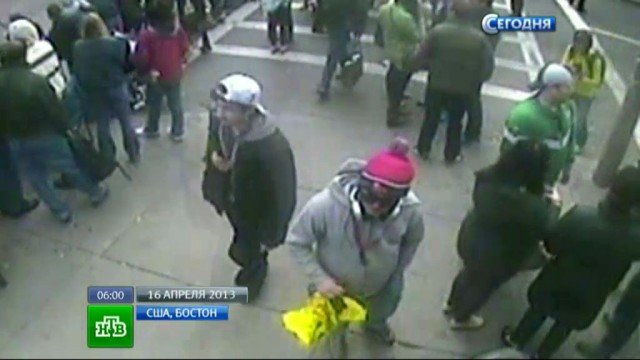 ФБР сегодня опубликовало фотографии двух подозреваемых в причастности к взрывам на Бостонском марафоне, а также видеозапись с камер наблюдения, расположенных рядом с местом трагедии. На кадрах видно двух мужчин в темных куртках и с рюкзаками. По словам следователей, тот, что в белой кепке, оставил свою сумку неподалеку от финишной черты.