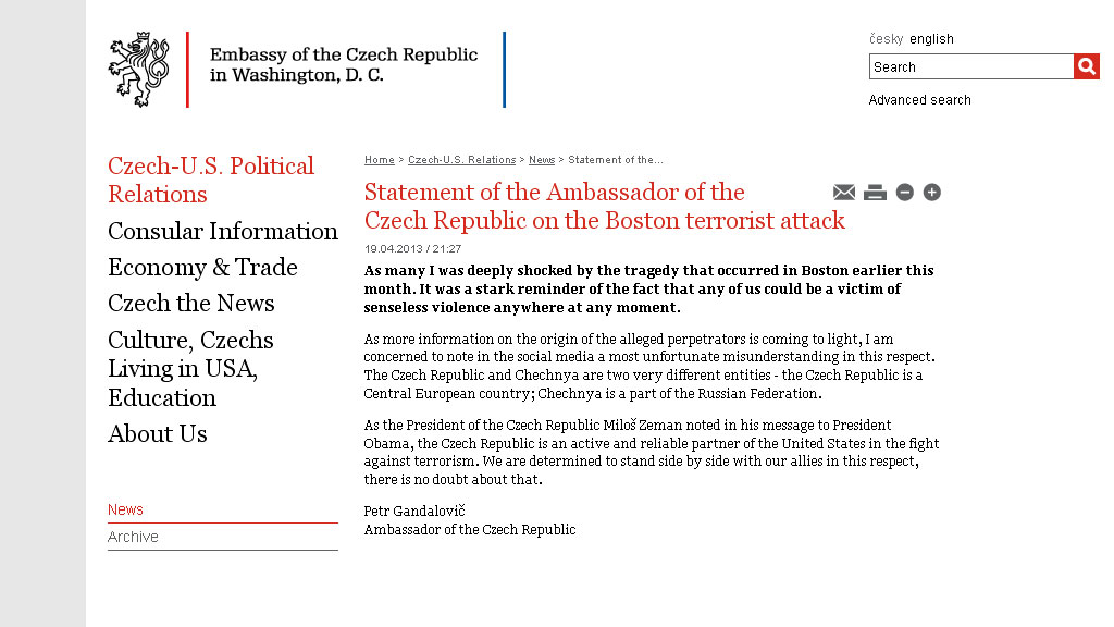 Чешский посол в Вашингтоне напомнил, что его сограждане не имеют никакого отношения к взрывам на Бостонском марафоне, поскольку «Чехия и Чечня разные вещи».