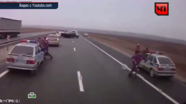 Дальнобойщик слишком поздно заметил аварию. Поняв, что остановиться точно не успеет, он решился на сложный маневр. Фура «змейкой» проехала мимо патрульных автомобилей, участников столкновения и эвакуатора, никого при этом не задев.