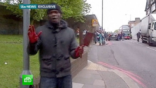 Кадры с места убийства британского курсанта в лондонском Вулвиче сняли простые прохожие, которым на камеры мобильных телефонов преступники давали интервью. На записи видно, как темнокожий человек с окровавленными руками извиняется перед женщинами, при этом он размахивает тесаком, с его пальцев капает кровь.