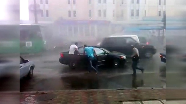 Так, в одном ролике видно, как стихия набирает обороты: ливень, больше уже похожий на мокрую бурю, буквально сметает людей с дороги. Ураган гнет деревья, прохожие, еле держась на ногах, спешат поймать автомобиль.