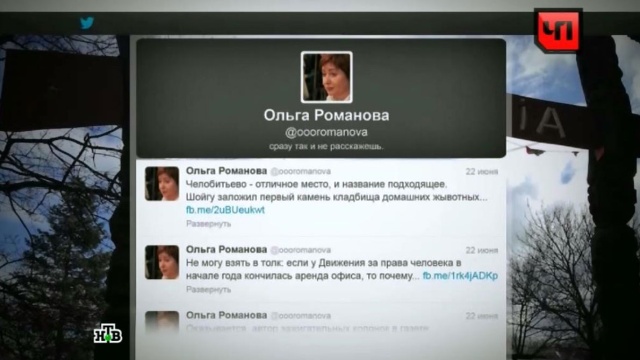 Журналистка и оппозиционерка Ольга Романова может пойти под суд за неосторожное высказывание в своем Twitter. Против нее ополчились ветераны, которых оскорбил ее комментарий об открытии национального воинского пантеона в Мытищинском районе. Со слов журналистки, Шойгу открыл не что иное, как «кладбище домашних животных».