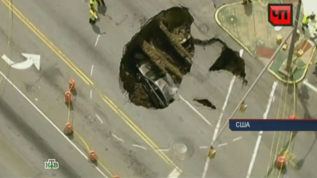 На оживленной трассе в американском штате Огайо провалился грунт. Женщина видела, что асфальт уходит, но сделать ничего не могла. В результате машина рухнула в трехметровую яму.