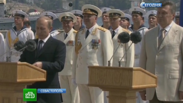 На адмиральском катере Путин и Янукович прошли вдоль военных кораблей, которые собрались в Севастопольской бухте. Сегодня Россия и Украина вместе празднуют День ВМФ.