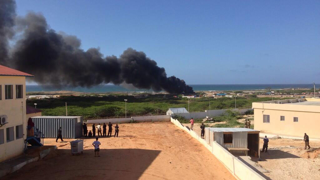 В международном аэропорту сомалийской столицы Могадишо после посадки взорвался военный самолет. Теперь в небо поднимает огромный столб черного дыма, рвутся боеприпасы.