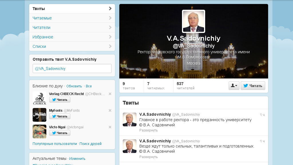 Ректор МГУ Виктор Садовничий стал заметным персонажем в Twitter уже через несколько часов после создания своего микроблога. Бдительные пользователи обнаружили, что Садовничий по неизвестной причине снабжает афоризмы известных мыслителей собственным копирайтом.