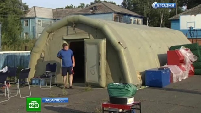 Жители Хабаровского края, чьи затопленные дома оказались не пригодны для жизни, перебираются в новый мобильный палаточный городок. Его минувшей ночью развернули спасатели МЧС.