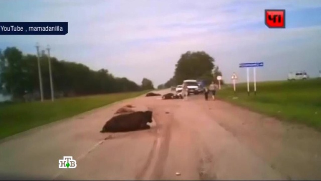 Последствия аварии, в результате которой погибли две коровы и две овцы, сняли на видео. Автобус, въехавший в стадо животных, буквально раскидал буренок по трассе.
