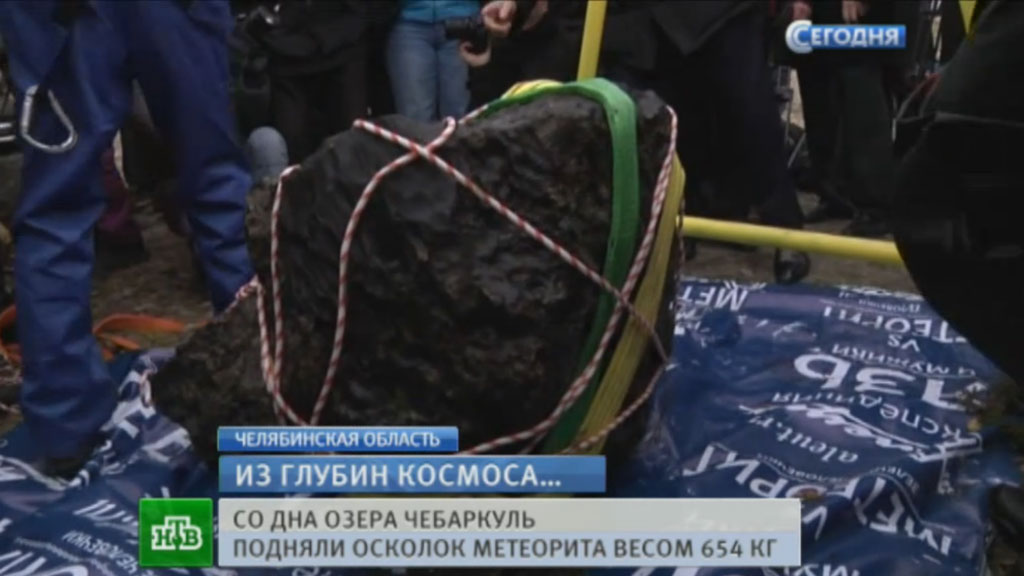 Огромный кусок метеорита, который подняли накануне со дна озера Чебаркуль, доставили в краеведческий музей Челябинска.