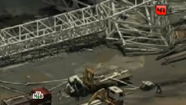 Крыша обвалилась, когда на нее упал большой строительный кран. Трое рабочих погибли под завалами, еще несколько человек получили серьезные травмы.