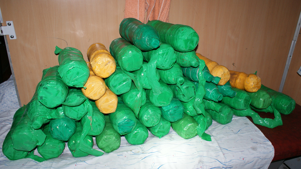 Ирина Гафурова, погрануправление по Калмыкии и Астраханской области: «В тайнике была обнаружена 21 полуторалитровая бутылка с веществом белого цвета с уксусным запахом. Предварительное исследование обнаруженного вещества показало, что это наркотическое средство — героин. Общий вес партии составил более 32 килограмма».