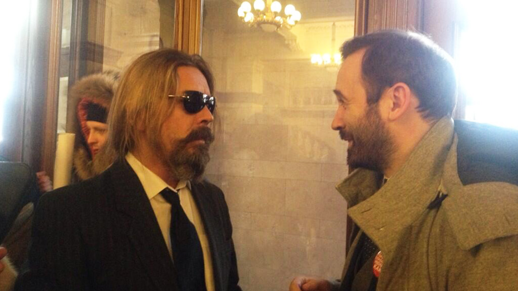 К избиркому рокер приехал на шикарном белом лимузине и с охраной. И встретил там другого кандидата — Илью Пономарёва. Последний и разместил в своем Twitter фотосвидетельство встречи с конкурентом, сопроводив снимок словами — «неожиданно встретили Паука на выходе из избиркома с его огромной свитой».