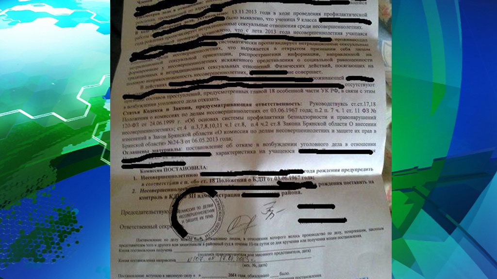 В постановлении говорится: признав себя лесбиянкой, девятиклассница «систематически распространяла информацию, направленную на формирование у несовершеннолетних искаженного представления о социальной равноценности традиционных и нетрадиционных сексуальных отношений».