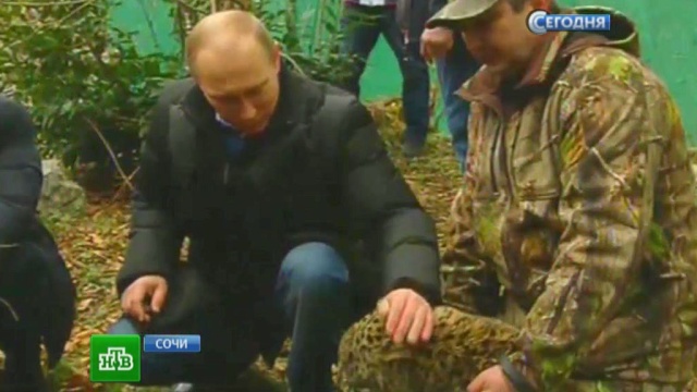 Во время посещения сочинского Центра разведения переднеазиатского леопарда Владимир Путин, представители МОК и журналисты зашли в клетку к шестимесячному хищнику по кличке Гром.