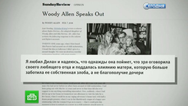 Вуди Аллен решил высказаться тем же способом — с помощью открытого письма в газету The New York Times. Он все отрицает и пишет, что заявления Дилан были сфабрикованы ее матерью, актрисой Мией Фэрроу, с которой Аллен разошелся в