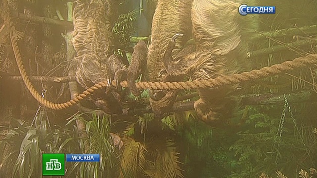 Четыре самки трехпалых ленивцев большую часть дня неподвижно свисают с ветвей деревьев в своем вольере. Теплый душ, который устраивают своим питомцам рабочие по уходу за животными и от которого в один момент запотевает камера, должен разбудить неторопливых зверей. Они стремительно (по меркам своего вида) перемещаются на нижнюю ветку и замирают в ожидании фруктов. Уже через минуту доносится довольное чавканье.