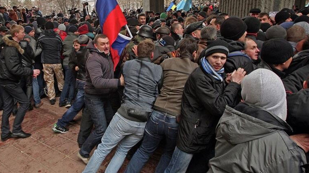 Группа митингующих пытается прорваться в здание Верховного совета Автономной Республики Крым в Симферополе, где с минуты на минуту должна начаться внеочередная сессия для обсуждения внутриполитической ситуации в стране.
