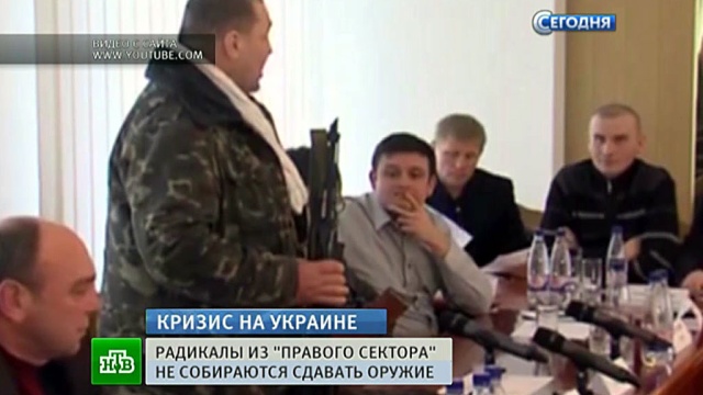 Член «Правого сектора»: «„Правый сектор“ будет носить оружие, пока будет считать это необходимым. Если власть будет вести себя не так, как надо, мы поставим ее на место. Кто хочет забрать мой автомат? Мой пистолет? Мой нож? Пусть подойдет и попробует забрать».