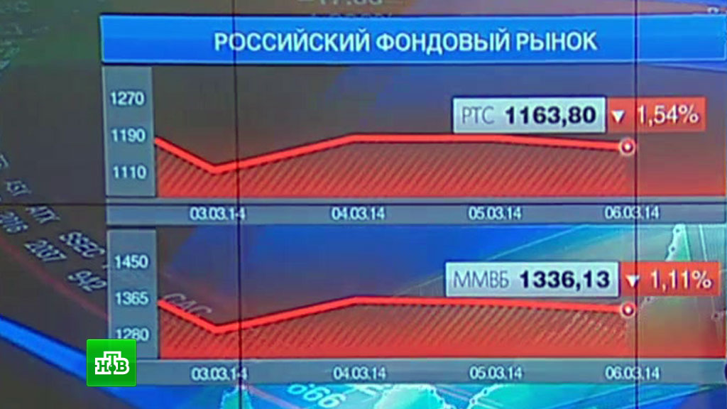 После сообщений о действиях крымского парламента увеличилось напряжение и на российском рынке акций, который упал к уровням начала недели.Индекс ММВБ упал ниже 1320 пунктов — это более 2% падения, РТС опустился ниже 1160 пунктов — это примерно -2,5%. Рублевые цены большинства «голубых фишек» на Московской бирже снизились в пределах 5%.