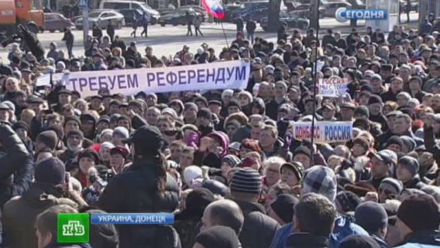 Среди митингующих есть сторонники «народного губернатора» Павла Губарева, которого на днях выкрали и перевезли в Киев украинские спецслужбы, передает