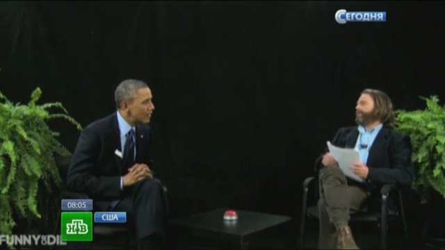 Президент США стал гостем юмористического шоу «Между двумя папоротниками». Туда приглашают музыкантов и звезд Голливуда, которым приходится отвечать на каверзные и часто неполиткорректные вопросы ведущего — американского комика Зака Галифианакиса, известного россиянам по фильму «Мальчишник в Вегасе».