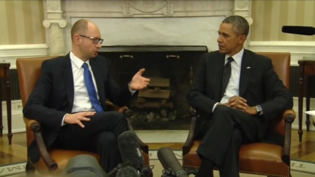 Встреча Обамы и Яценюка состоялась в Овальном кабинете. У ограды Белого дома в этот момент проходили две манифестации. Одна — под украинскими флагами, вторая — более многочисленная и шумная — под транспарантом «Нет — неонацистскому перевороту на Украине!»