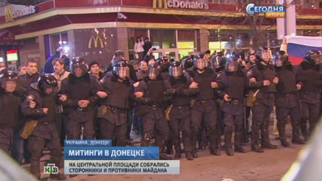 Неспокойно сегодня вечером было в столице Донбасса. В центре Донецка прошли сразу два митинга сторонников Майдана и тех, кто выступает за проведение референдума о статусе региона. Причем оппоненты решили выразить свою позицию на одной и той же площади. Охладить накал страстей пытался кордон милиции.