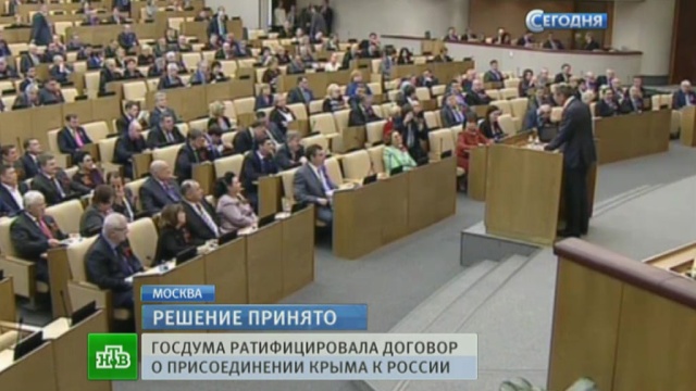 Договор ратифицировали, закон приняли в первом чтении и окончательно. За воссоединение Крыма и Севастополя с Россией проголосовали «за» абсолютным большинством голосов, передает корреспондент НТВ Егор Колыванов.