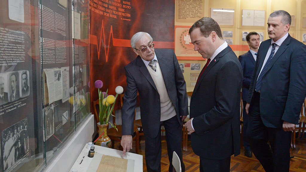 Кроме того, премьер возложил венок к Вечному огню Мемориала героической обороны Севастополя. После возложения цветов Медведев и члены его делегации почтили минутой молчания память погибших.