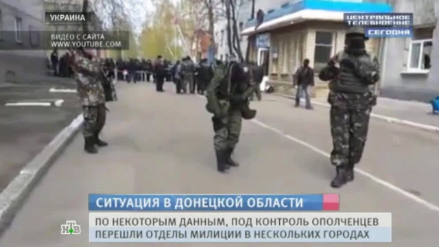 Отряды ополченцев взяли под контроль отделы милиции еще в трех городах, а в самом Донецке протестующие заняли здание областного УВД. Как сообщает корреспондент НТВ Евгений Голованов, события в Донецке и области развиваются стремительно. Началось все в 6 утра, когда сторонники «Антимайдана» захватили здание Донецкой областной прокуратуры. Дальше произошел «эффект домино».