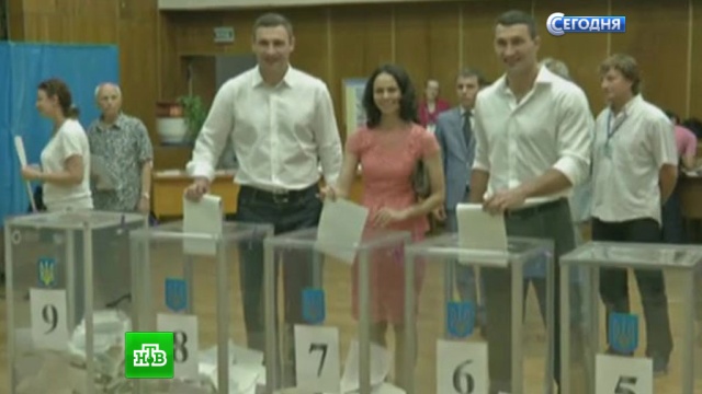 В Киеве наблюдается высокая активность на выборах, передает корреспондент НТВ Сергей Савин. Есть даже очереди, но отчасти это вызвано еще и тем, что в городе проходят выборы мэра и депутатов городского парламента. Тем не менее люди терпеливо стоят в очередях, несмотря на духоту и жару. Украинский премьер Арсений Яценюк терпеливо отстоял