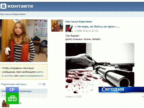 Накануне самоубийства на интернет страничке Настасьи среди приколов и анекдотов, которыми сегодня обмениваются школьники появляется картинка с пистолетом и кровью, следом обновление статуса: «Ненавижу фразу „а если твои друзья с 9 этажа прыгать пойдут, ты тоже пойдешь?“ Да пойду, что мне без друзей делать».