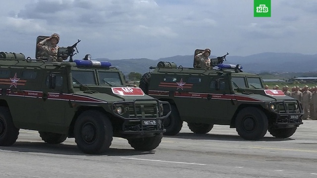 Около 750 российских и сирийских военных приняли участие в параде на авиабазе Хмеймим в честь Дня Победы.