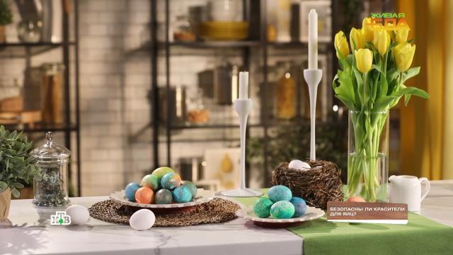 Используя для крема или другой пищи пасхальные красители, есть риск накормить себя и близких слишком большим количеством краски, не всегда совсем уж безвредной. Есть ли смысл так рисковать? Чтобы проверить, как ведут себя яичные красители при нетипичном использовании, программа «Живая еда» вместе с кондитером Егором Куликовым провела