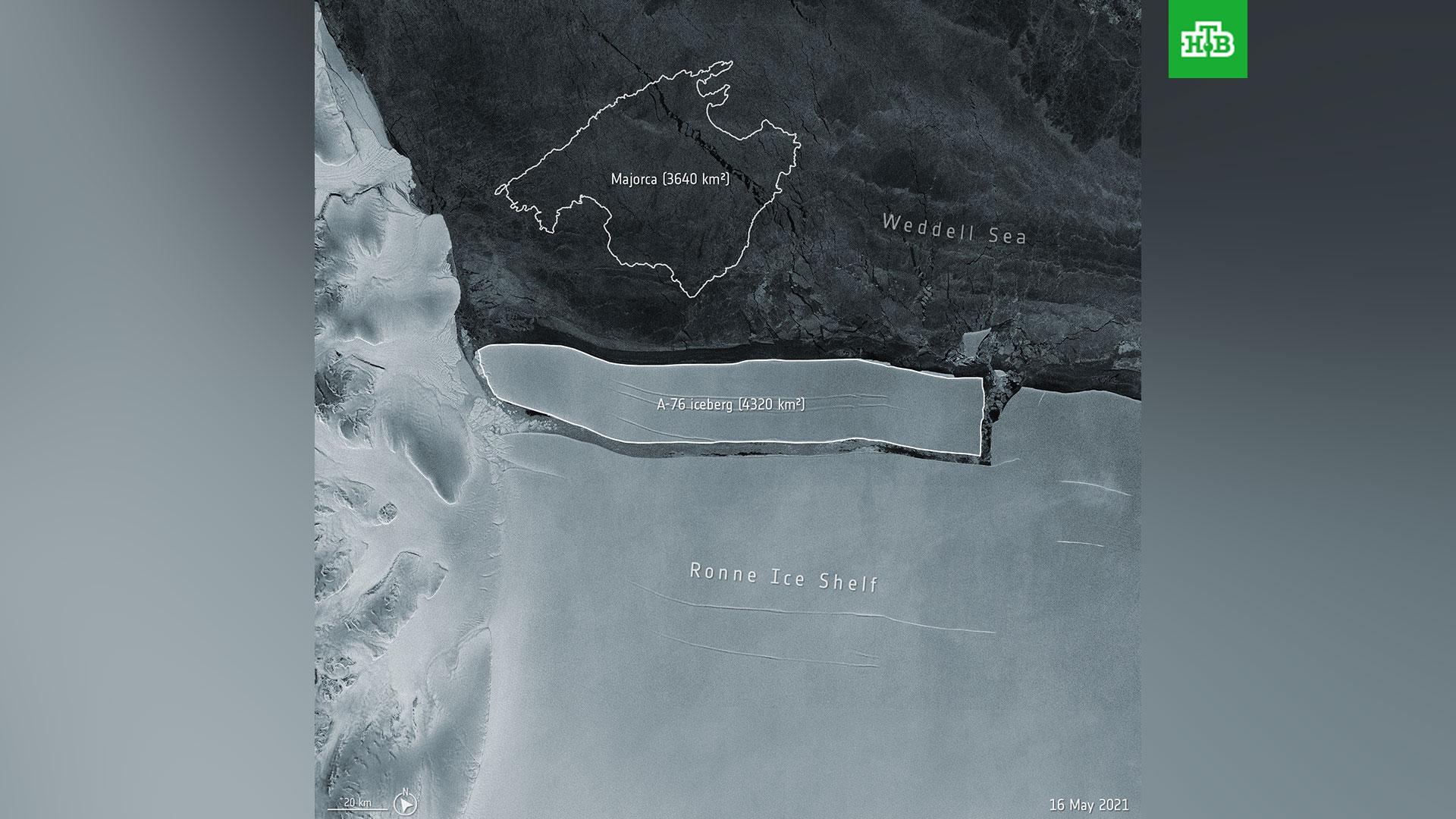 От Антарктиды откололся самый крупный на данный момент айсберг в мире. Его площадь составляет порядка 4 320 квадратных километров, что превышает размер острова Мальорка (3 640 квадратных километров). Об этом сообщает Европейское космическое агентство (ESA), чей спутник снял айсберг из космоса.