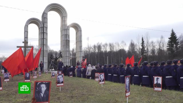 Под Калугой с воинскими почестями перезахоронили останки героев-десантников , которые в 1942 году вели активные боевые действия в тылу противника и несколько месяцев сдерживали немецкие дивизии под Вязьмой.