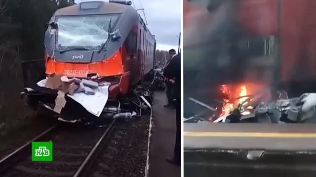 Первый вагон электрички сошел с рельсов. Небольшой грузовик, перевозивший товары одного из маркетплейсов, превратился под ним в груду искореженного металла. Водитель погиб.