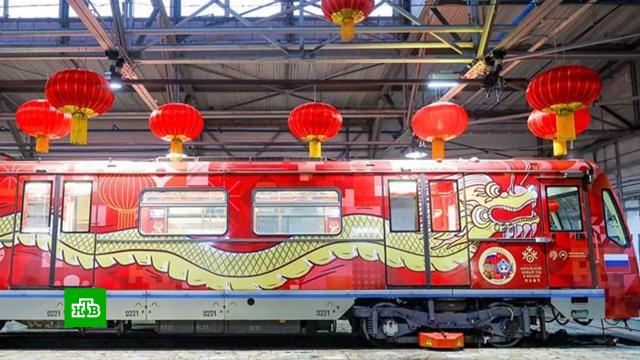 Новый тематический поезд оформлен в традиционном цвете Китая — красном. С внешней стороны вагонов изобразили змею и китайского дракона, а внутри пассажиры могут увидеть фотографии празднования Нового года в Китае.