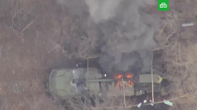 На опубликованных Минобороны кадрах видно, как барражирующий боеприпас «Ланцет» попадает точно в «Богдану», после чего она вспыхивает.