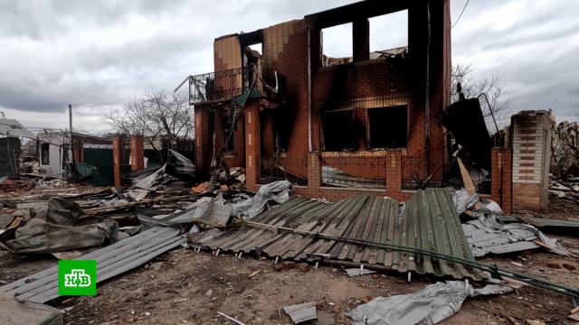 Везде следы, оставшиеся от оккупантов. Магазины и дома разграблены. Центр города даже местные с трудом узнают. На площади перед памятником — уничтоженный Вечный огонь. Перед дворцом культуры — призыв к американскому президенту не бросать киевский режим. Дальше административные здания, точнее то, что от них осталось.