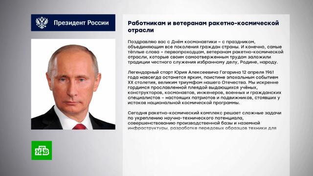 Президент России Владимир Путин поздравил работников и ветеранов ракетно-космической отрасли с Днем космонавтики.