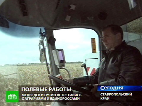 В1: Сегодня на кукурузном поле под Ставрополем грохотали комбайны, убирающие , убирающие оставшийся урожай. За рулем сидели Дмитрий Медведев и Владимир Путин. Президент и премьер приехали сюда, чтобы провести встречу с местным активом «Единой Россией» и пообщаться с аграриями. Максим Березин наблюдал.