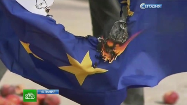 Аграрии Каталонии после введения санкций не знают, куда девать урожай фруктов. В городе Льейда они пришли к стенам местного правительства, свалили на площади сотни килограммов персиков и сожгли флаг ЕС.