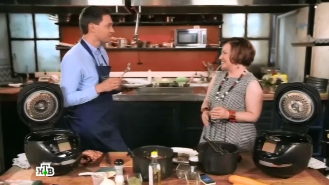 Протестировать новомодный прибор ведущий программы решил вместе с Еленой Чекаловой — известным кулинарным экспертом, начинающим ресторатором и большой любительницей мультиварок. Она даже своего супруга, легенду отечественного телевидения Леонида Парфёнова, научила готовить в кухонном гаджете новой эры. И написала об этом целую книгу.